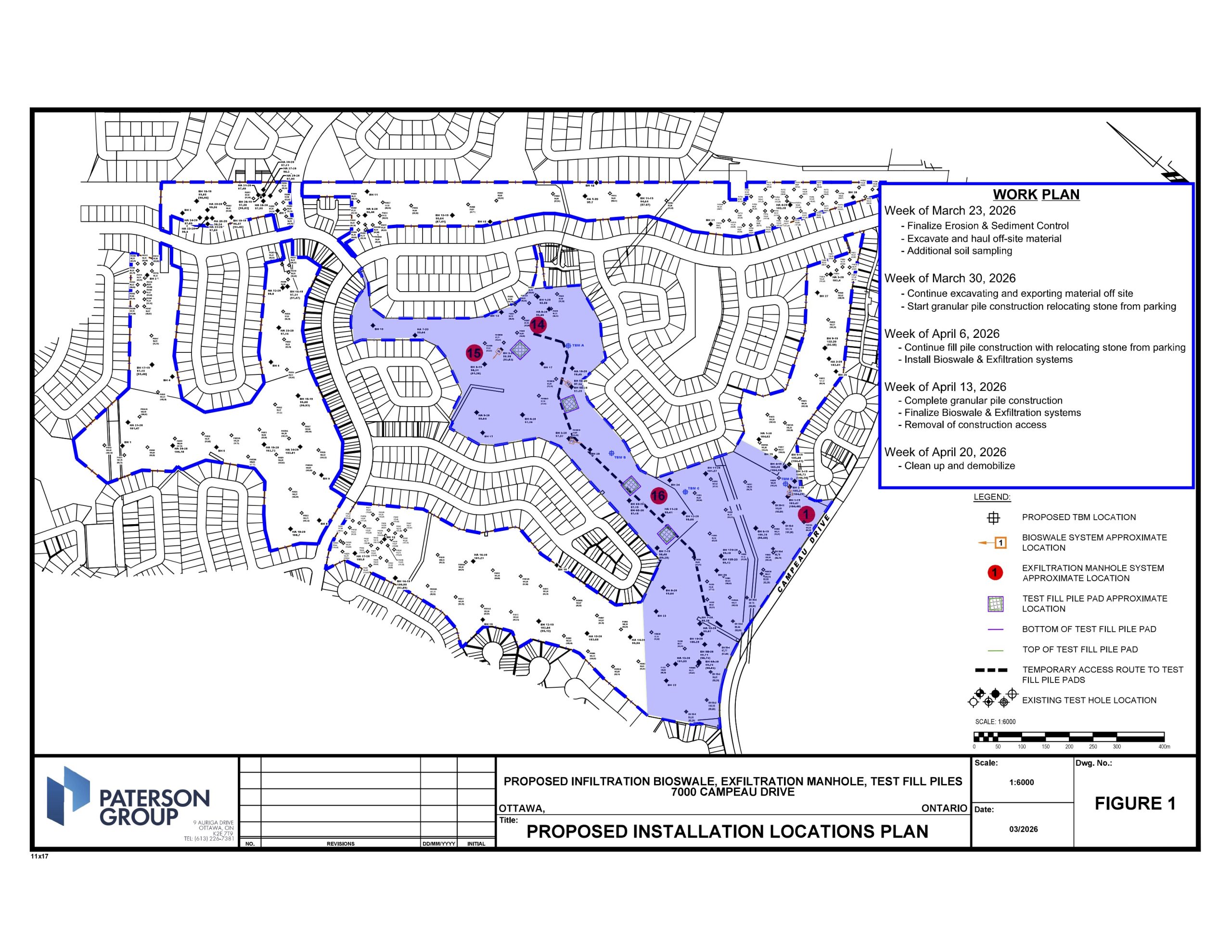 • Starting Monday, March 23, 2026, crews will begin hauling material from beneath the footprint of the test fill piles off-site to a designated facility. This will be followed by the construction of the four ‘test fill pile pads’ (gravel piles). Work on erosion and sediment control measures around the ‘exfiltration manhole system’ and ‘bioswale system’ will also begin next week. Any additional areas that require excavation will continue to be tested in advance of any fill movement.